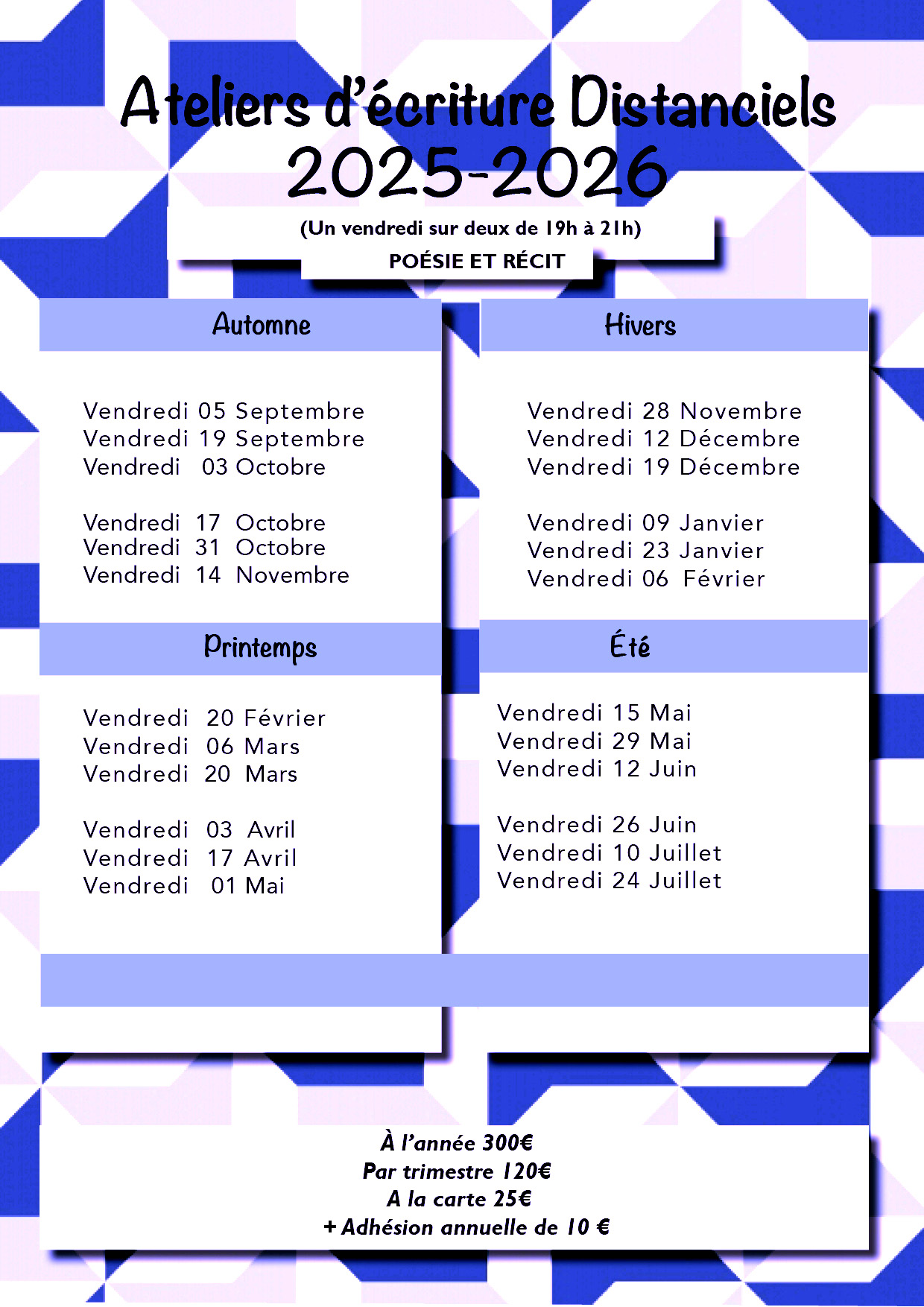 Mais de grâce, vous pouvez aussi opter ne venir qu’aux séances de poésie ou de roman. Et dans ce cas, ce sera un vendredi par mois.